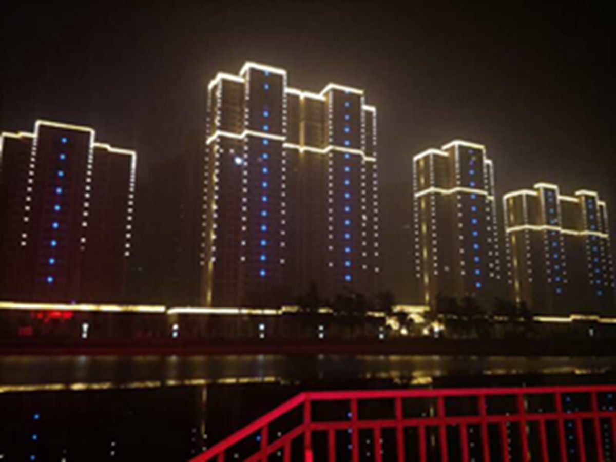 金河灣小區(qū)緊挨護(hù)城河,整體構(gòu)思以“黑夜的星空”為主,突出頂部輪廓,體現(xiàn)整體布局,主要以點(diǎn)光源作為點(diǎn)綴,使樓體呈現(xiàn)出閃閃發(fā)光的視覺體驗(yàn),水中倒映著,更別有一番意境。